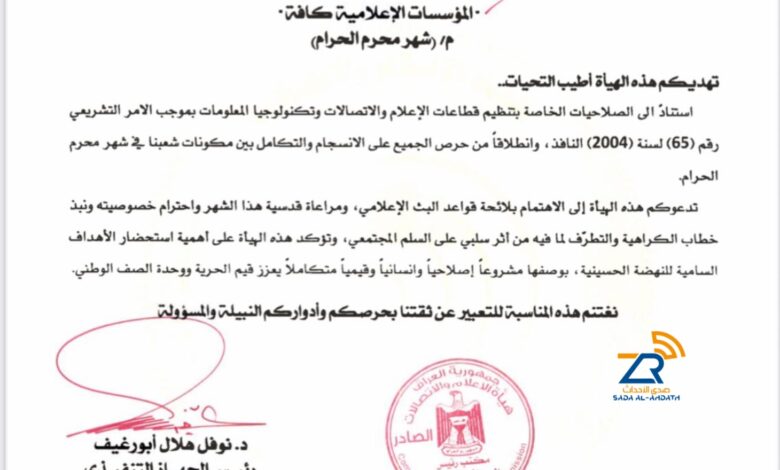 توصيات هيئة الاعلام والاتصالات لجميع المؤسسات الاعلاميه خلال شهر المحرم الحرام